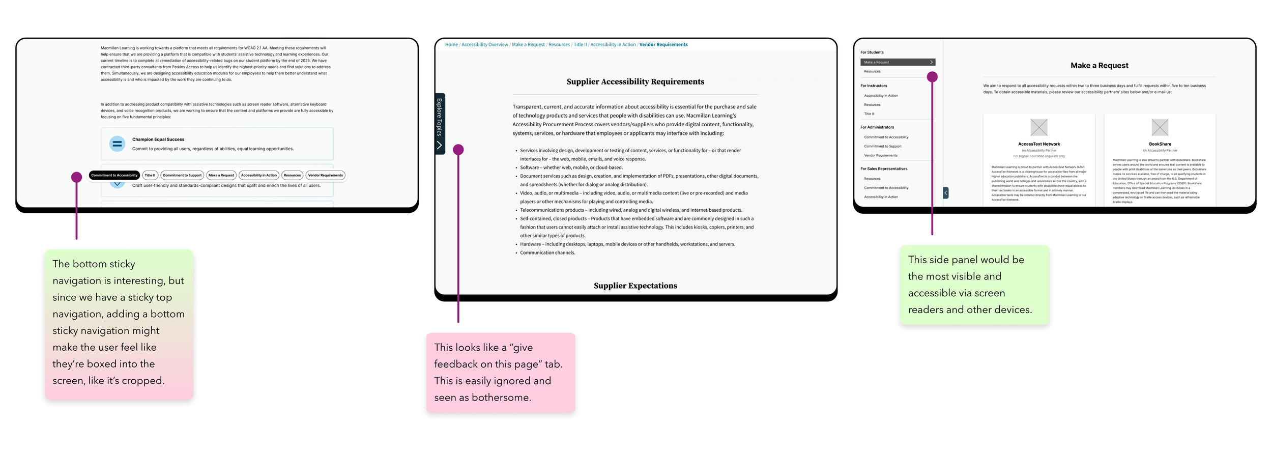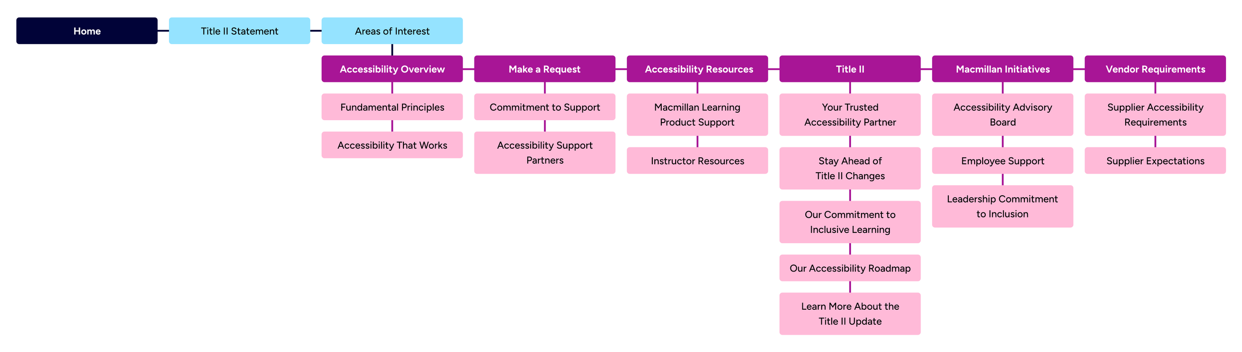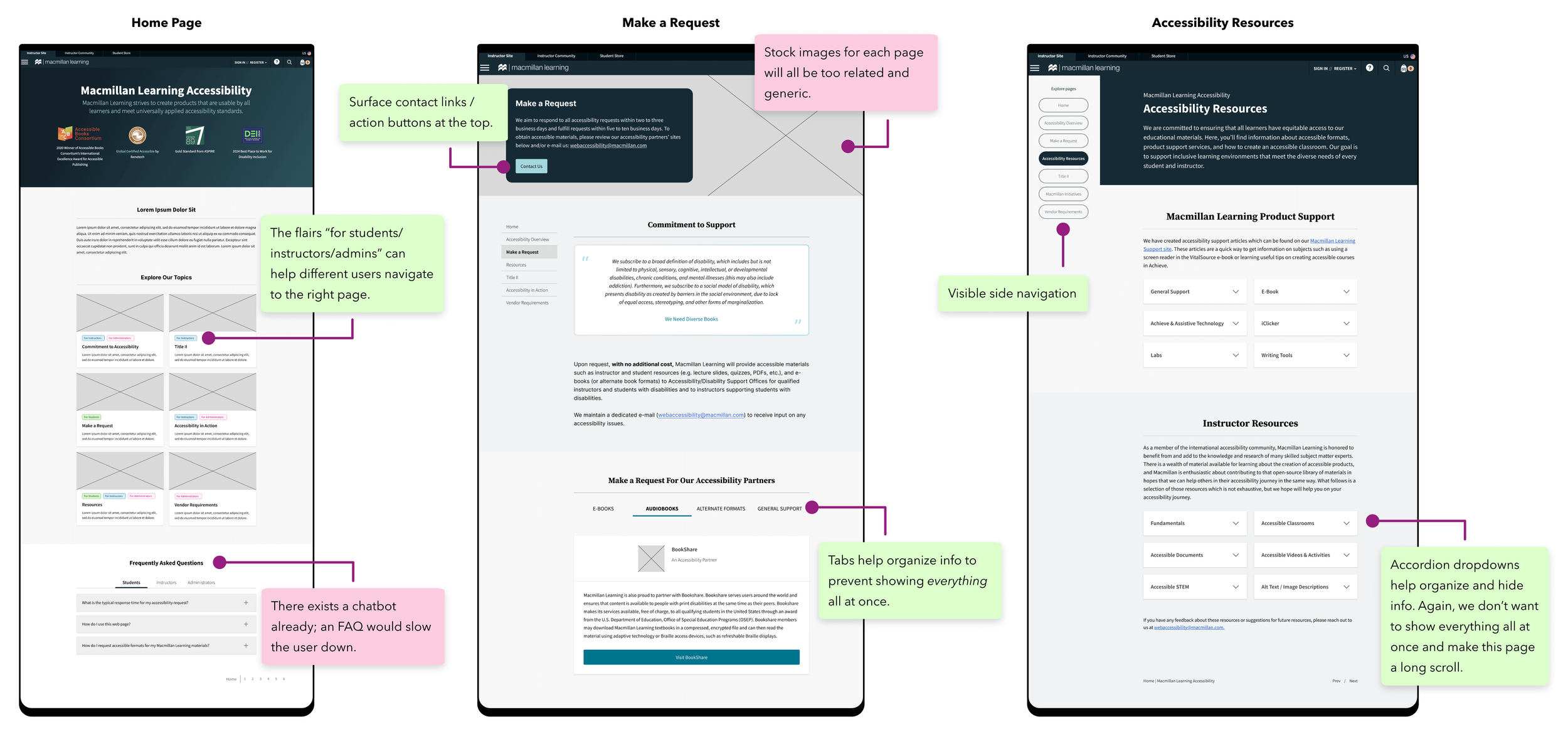 Redesigning and updating Macmillan’s old accessibility page is the main goal. By improving site navigation, organization of topics, and having resources be accessible in a timely manner, the page will perform much better and address student and instructor pain points.