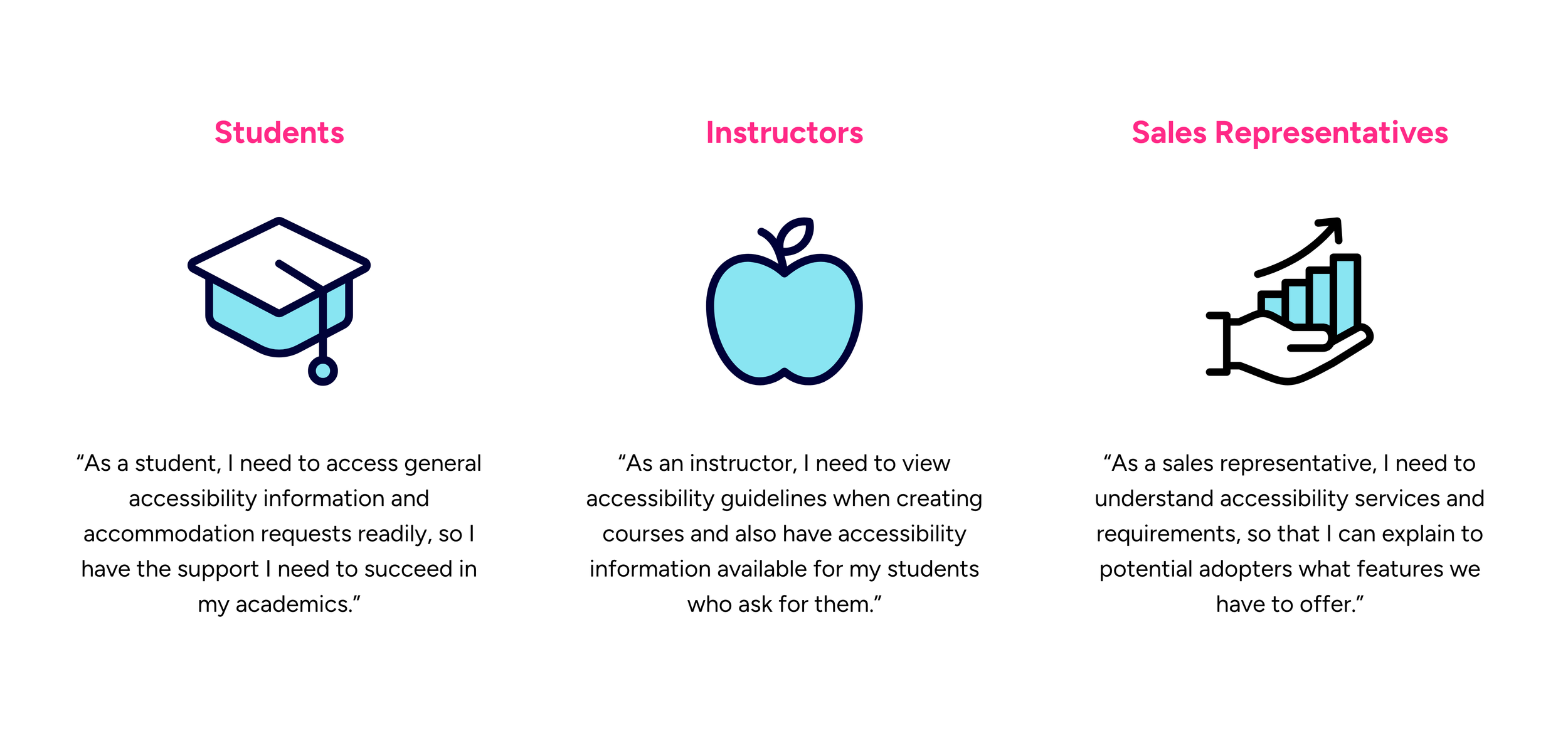 We started off by finalizing what the main jobs to be done were. Macmillan Learning’s main audience seeking accessibility resources are students, instructors, and sales representatives. By laying out the main JTBD, we can hone in on how we redesign the site, especially in terms of navigation.