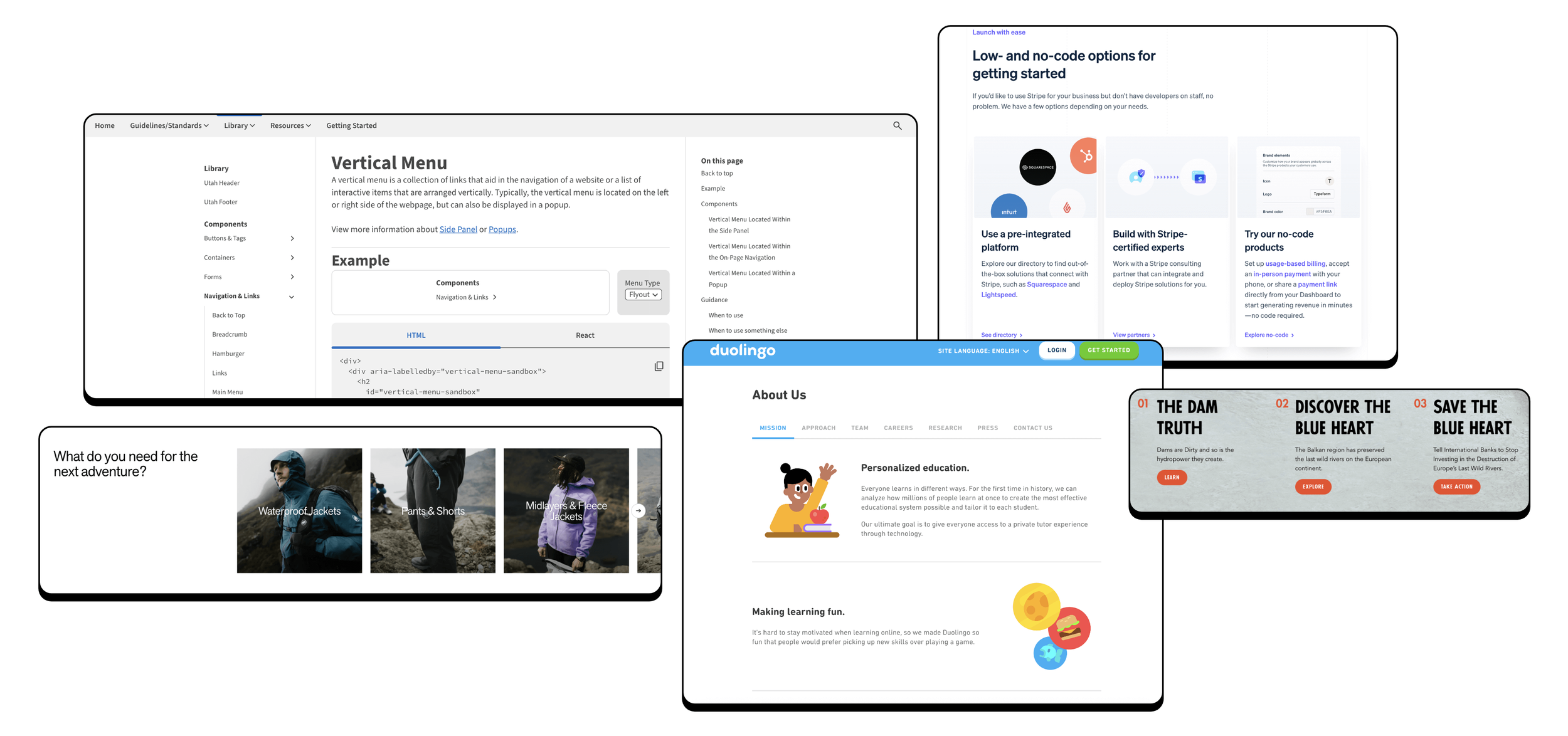 One of the key stakeholder constraints on the design is that we needed to stay away from a top navigation bar, as they specifically stated to not have any more headers above, due to reducing visual complexity. Thus, our benchmarking had zero top navigation. In our benchmarking, we wanted to bring some vibrancy and a dynamic layout to the static page. Elements like open space between elements, visuals, drop-downs, tabs, cards, etc help organize the walls of text on the existing site and make the page more interesting.