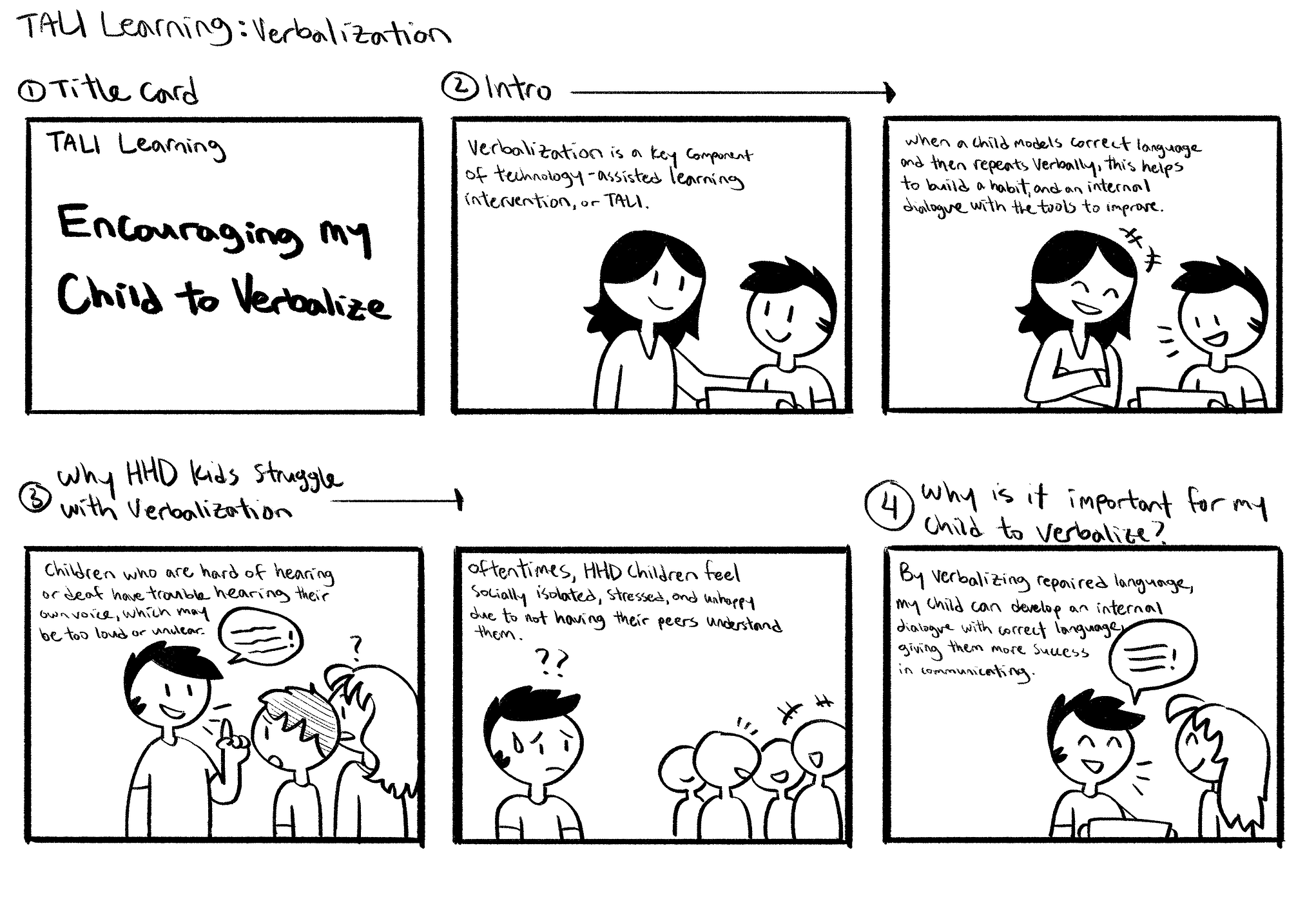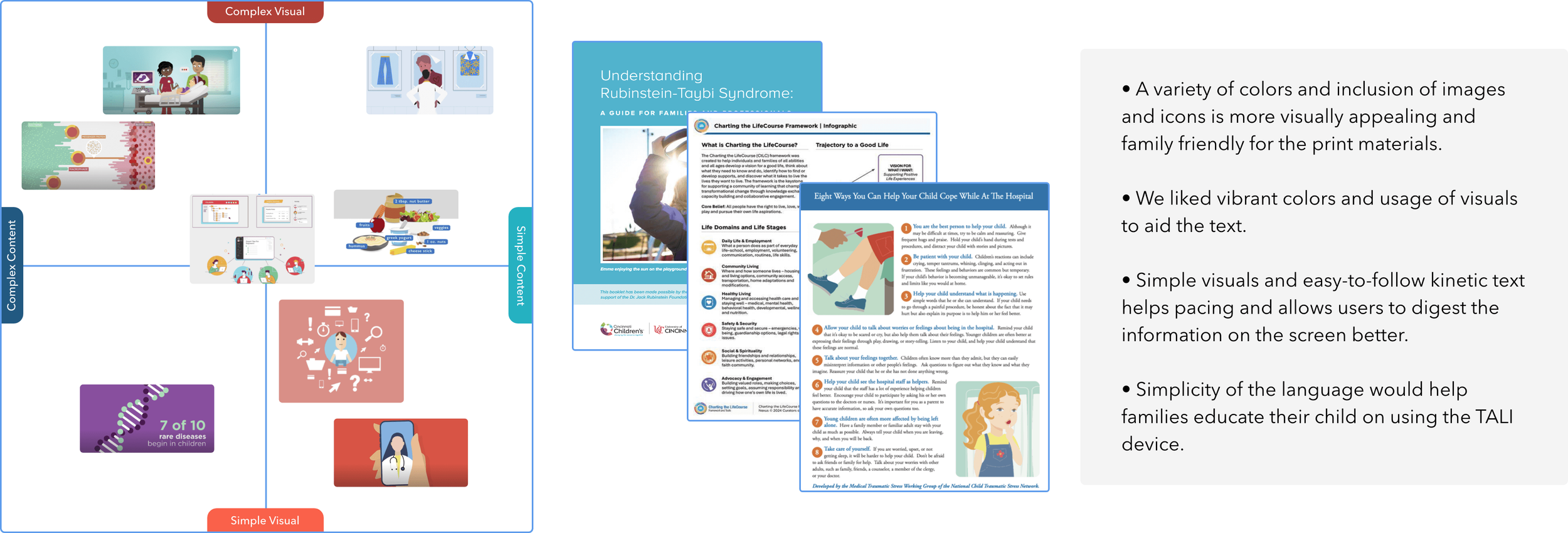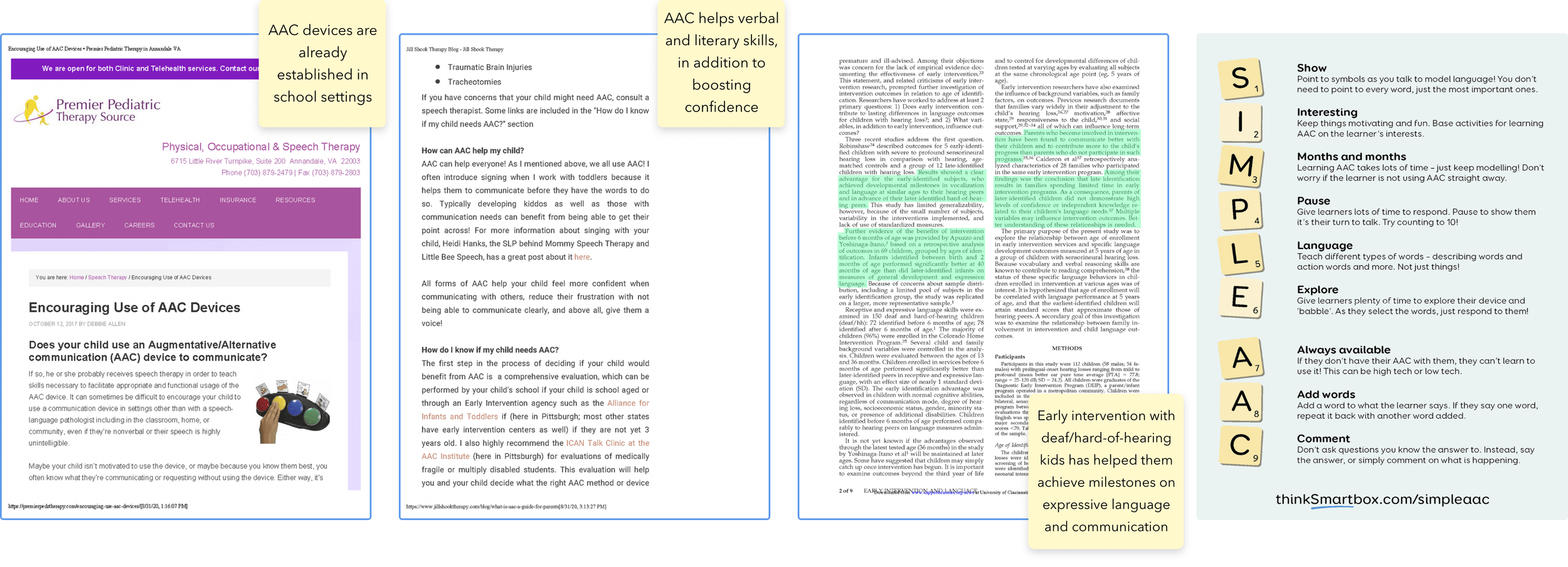 We looked at AAC materials, their usage in classroom and home settings, and why they are a crucial component in overcoming the effects of hearing loss. Afterwards, we benchmarked various healthcare educational resources to get an idea on how to design for the TALI print materials. We also benchmarked educational videos for inspiration for when we design the videos.