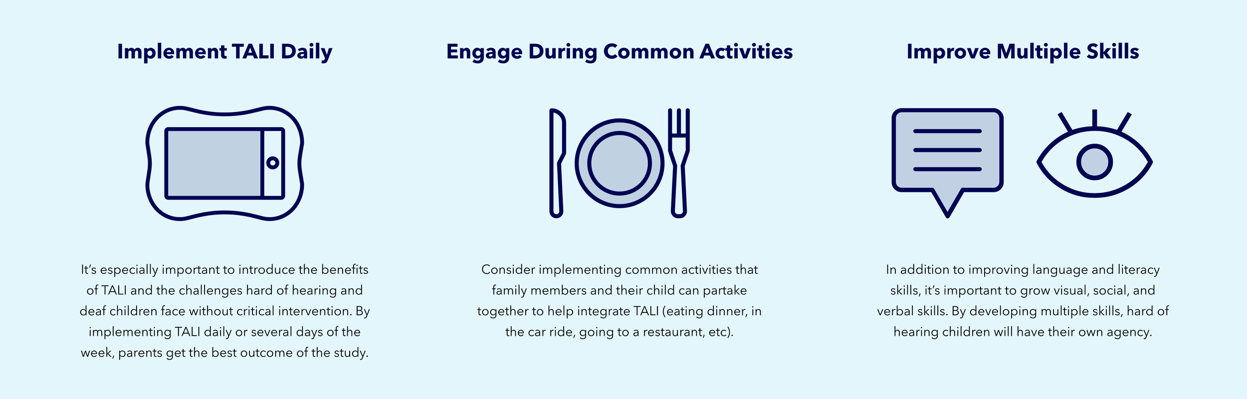 Technology Assisted Language Intervention (TALI) demonstrates that augmentative and alternative communication (AAC) technology provides visual supports for linguistic concepts. Voice output serves as a mode of feedback for verbal expression, which are beneficial characteristics for a child who misses out on key aspects of language due to hearing loss.