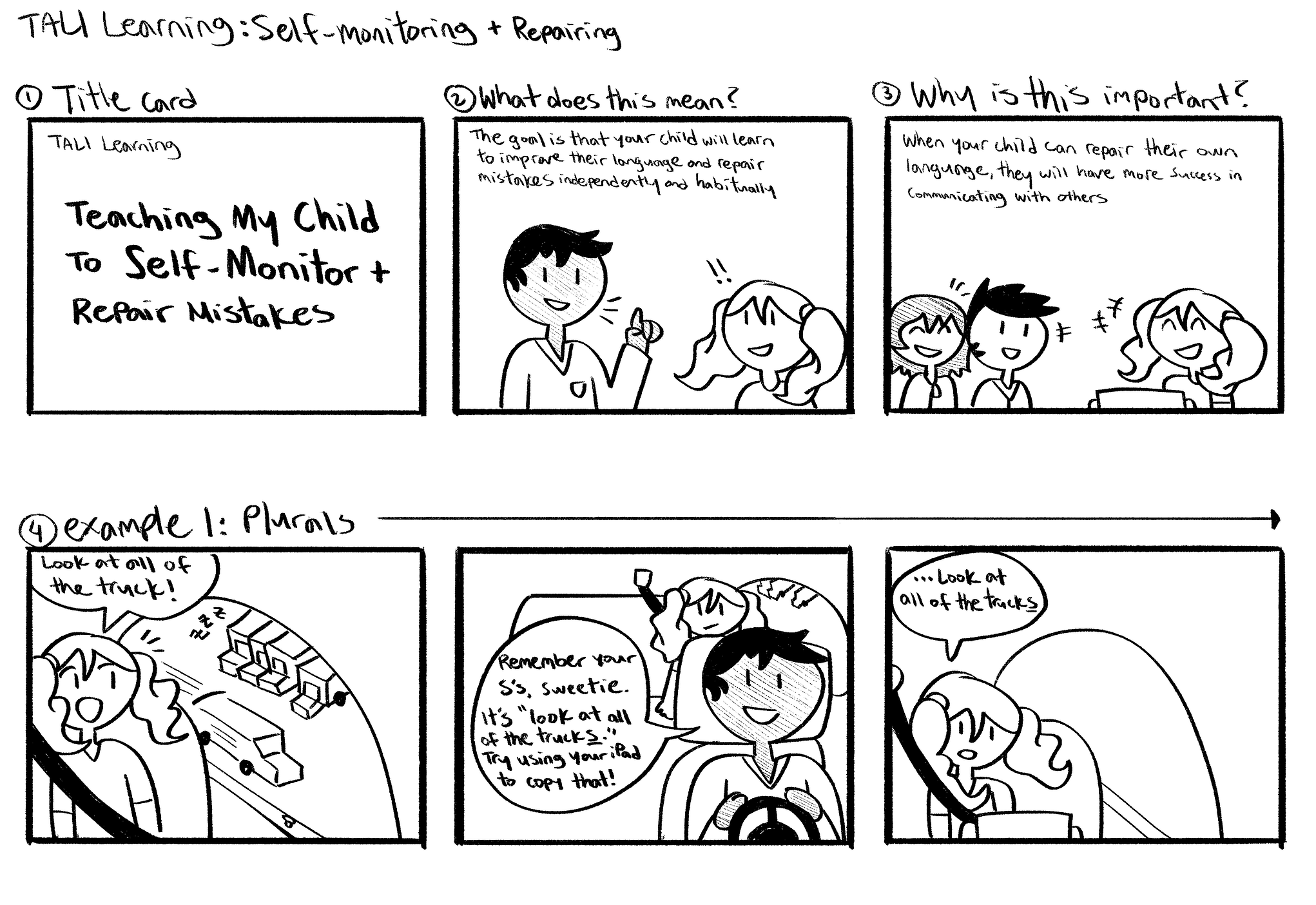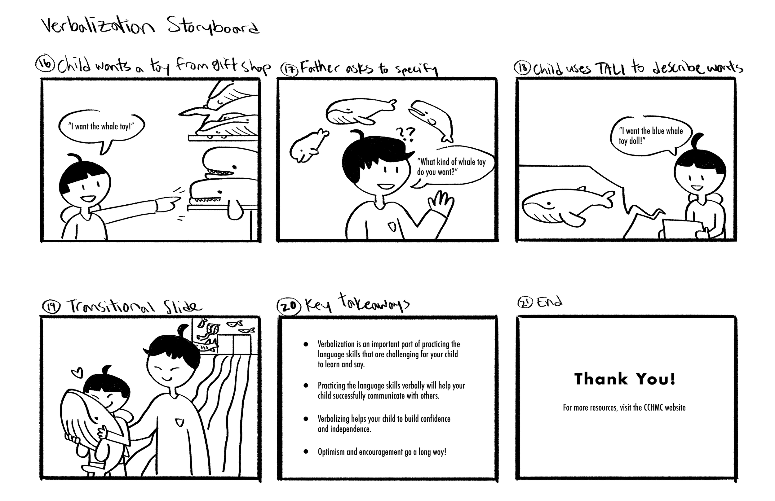 After our interviews and persona creation, the team moved onto creating the content for the analog materials as well as scenarios and specific language goals for the videos. The speech pathologists wished to see topics such as repairing and fixing language and grammar mistakes and encouraging children to speak using language as the main subjects.