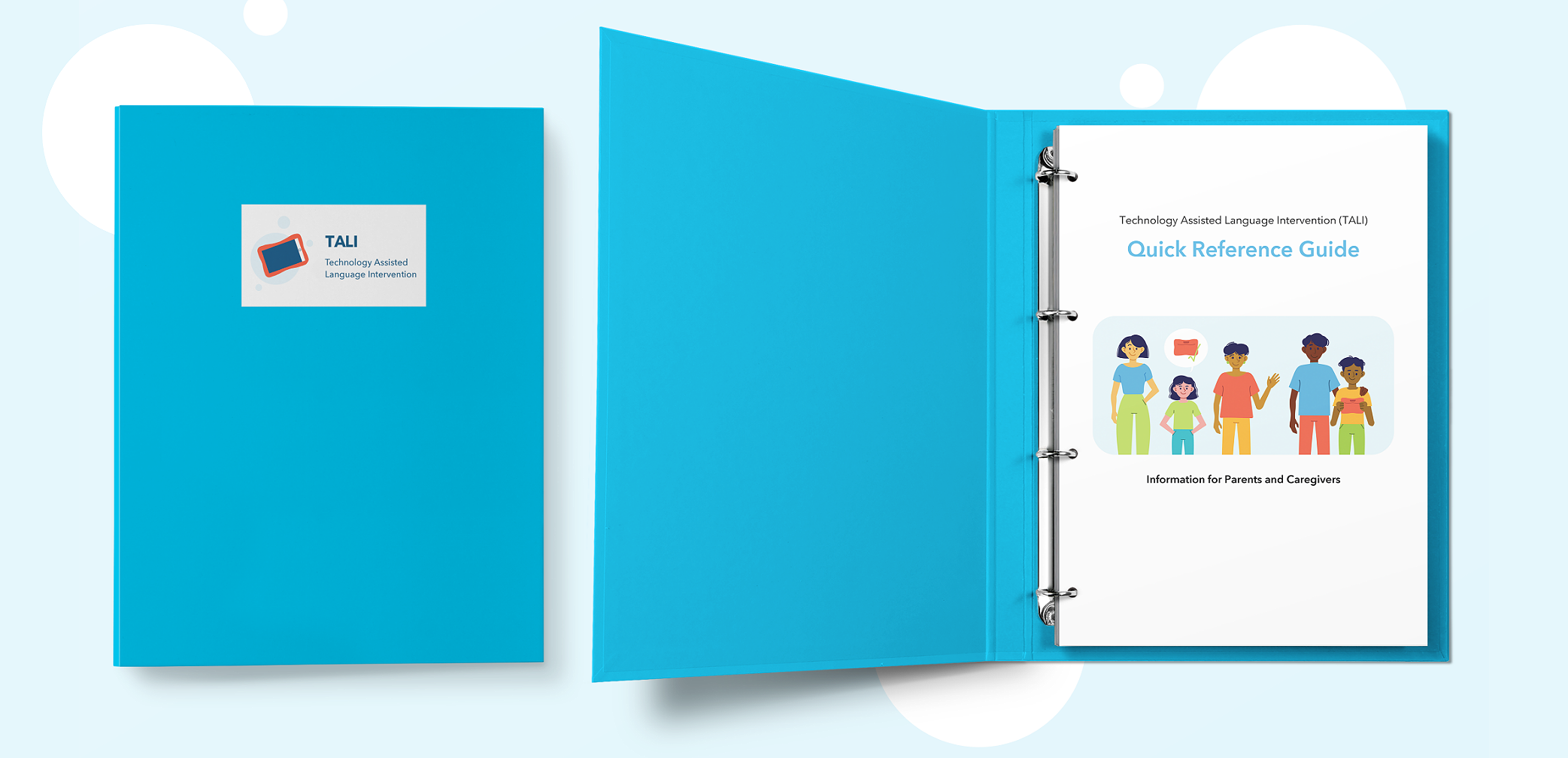 The family guide includes general information on what TALI is, goal-setting worksheets, and progress tracking on engagement. Examples scenarios of using TALI to help a hard-of-hearing child handle issues that come on with hearing loss are included. The materials are in a binder for easy portability and convenience.