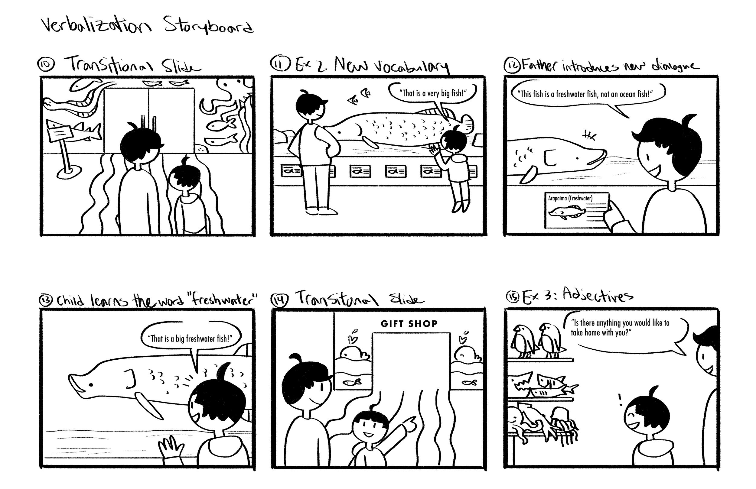 This scenario follows Sylvester and his father as they venture into the aquarium, helping Sylvester verbalize more as he is content and relaxed in his favorite environment. All storyboards are created by me.