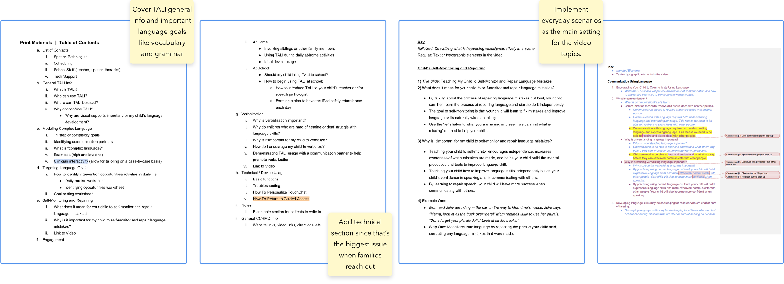 We took our findings from our interviews and meet-ups with the CCHMC speech pathologists to devise a mind map of how we want to frame the content for the print guide and videos. Tracking skill development and engagement were the most crucial topics of TALI, and we landed on modeling complex language for the videos, which would target the aforementioned topics.