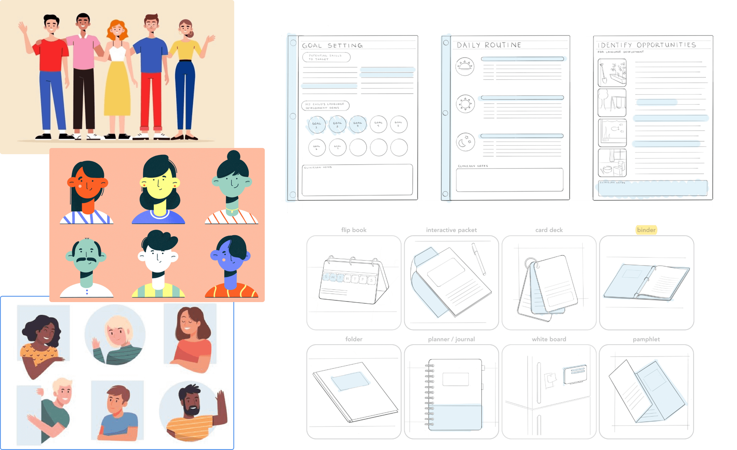 Hannah and I benchmarked simple, visually-appealing character designs, styles, and colors that we could reference from for sketching. We sketched out characters to look vibrant, family-friendly, and easy-to-understand. We also sketched out storyboard scenarios, covering important language goal topics. For the print analog materials, Rachel sketched out several worksheet examples and devices, with the binder being the most versatile and portable.